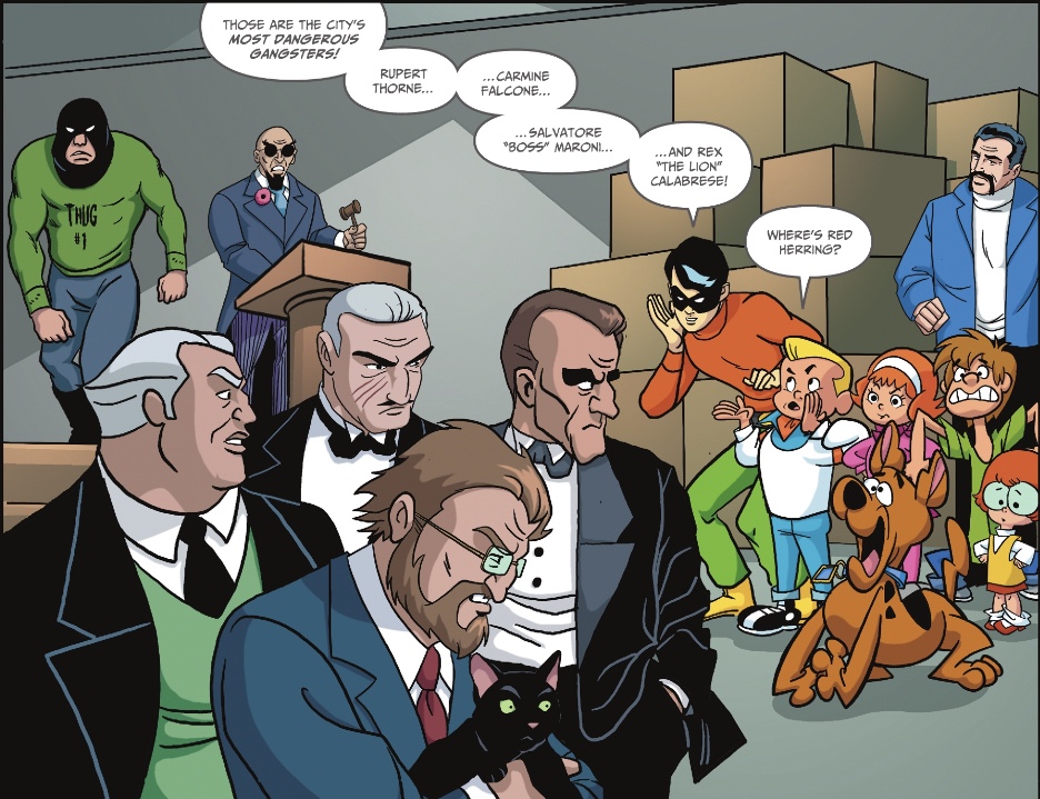 The disguised Bruce and the seasoned ‘tec come to a deal – if he acts as babysitter to the younger kids, he can come along on cases. Fred reckons he already has a mystery to solve