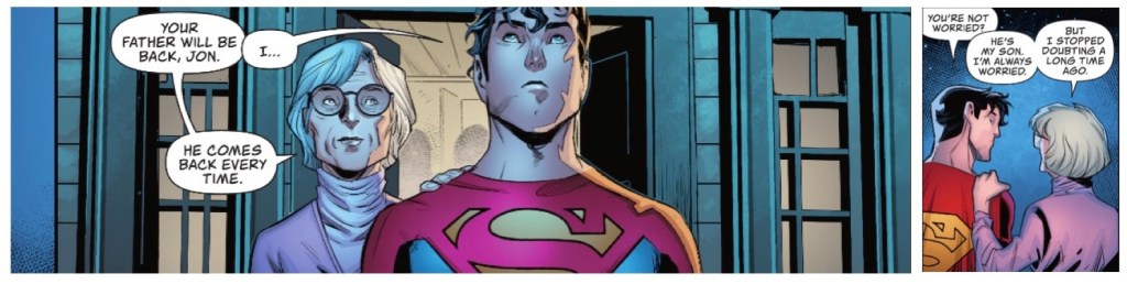 The best moments are the conversations Jon has with his dad, and the teamwork between them – when Superman comes back from his Warworld adventure in Action Comics, I’d love this book to be retitled Superman & Son, showcasing both Men of Steel. Or even better, give Lois, Martha and Jonathan regular roles in a series entitled Superman Family.