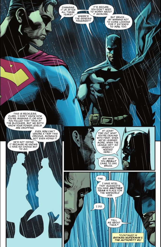 The issue closes with Superman and his new Authority setting off for Warworld.