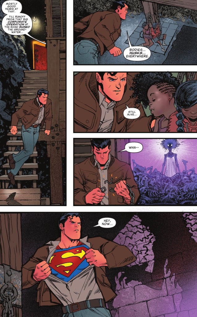 The final story features Superman and Lois, missing children and a cellar… don’t go into the cellar, Clark! Of course, he does, in an effective chiller by writer Jeremy Haun and artists Tony Akins and Moritat. Just look at the way Moritat – doing colours as well as inks – makes that costume pop. I think I’d enjoy a whole road trip series by this team!