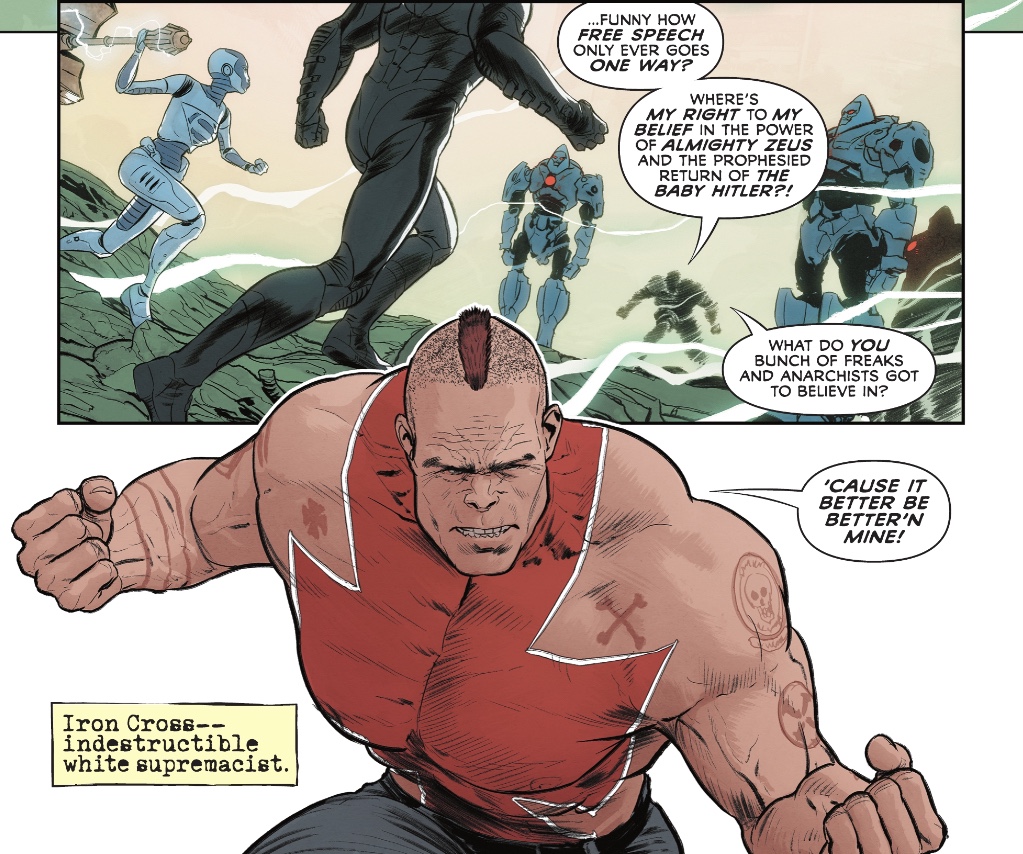 Another reason I smile whenever Enchantress appears is that she lights up the pages. Colour queen Jordie Bellaire’s palette, likely worked out with Janín, uses a lot of grimy greens, but our resident witch manifests in excessive emerald. And there’s a fantastic splash of yellow as one Authoritarian introduces themselves to Iron Cross.