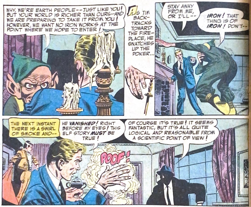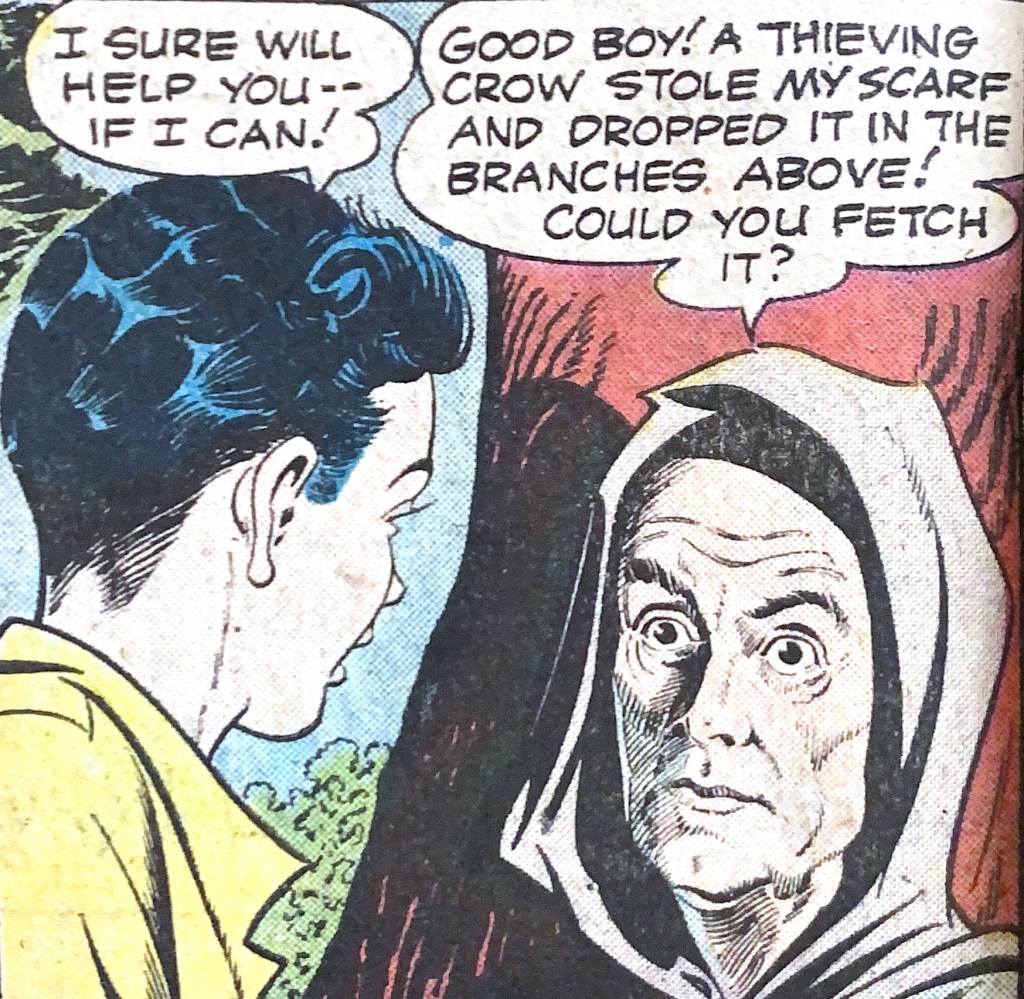 ‘The reluctant sorcerer’ features art by the excellent Howard Purcell, but it’s not moody art, his story of a kid given magical powers by an old lady being set entirely in daytime. The young boy, Tommy, isn’t even reluctant, he’s as delighted as any of us would be, in a tale that just fizzles out. Surely there were better Fifties stories editor Joe Orlando could have reprinted.