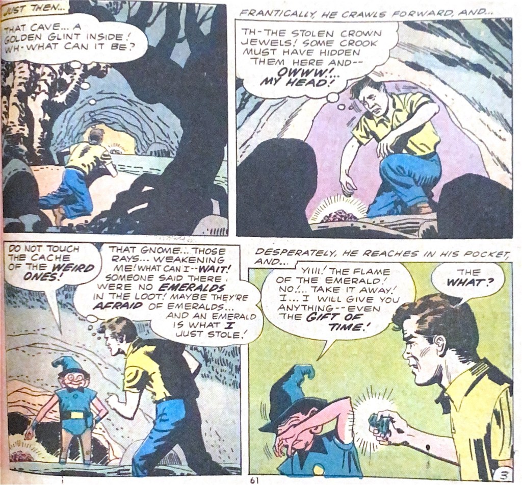 Stolen gems, enchanted forests, weird gnomes… ‘The gift that wiped out time’ is an amiable story of a man on the make, with accomplished art by Mort Meskin and George Roussos, but the unknown writer fails to elicit any chills.