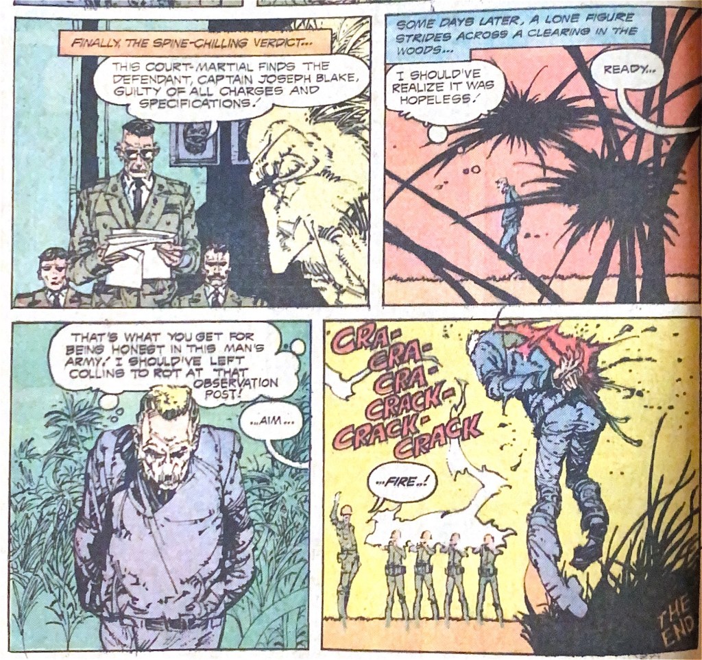 The issue’s second werewolf stars in ‘The claws of death’ and while the meat of George Kashdan’s tale is pretty familiar, the ending is horrifying. As with the previous story, it’s thanks to the humanity of the participants rather than any supernatural intervention. The soldier who shoots a subordinate-turned-werewolf is court martialed because, well, who believes in wolfmen? The beautifully ugly art choices of Alex Niño sell the horror, with the final panel being very intense for the era. And plug-wise, this comes with a bottom-page shout-out to Weird War Tales.