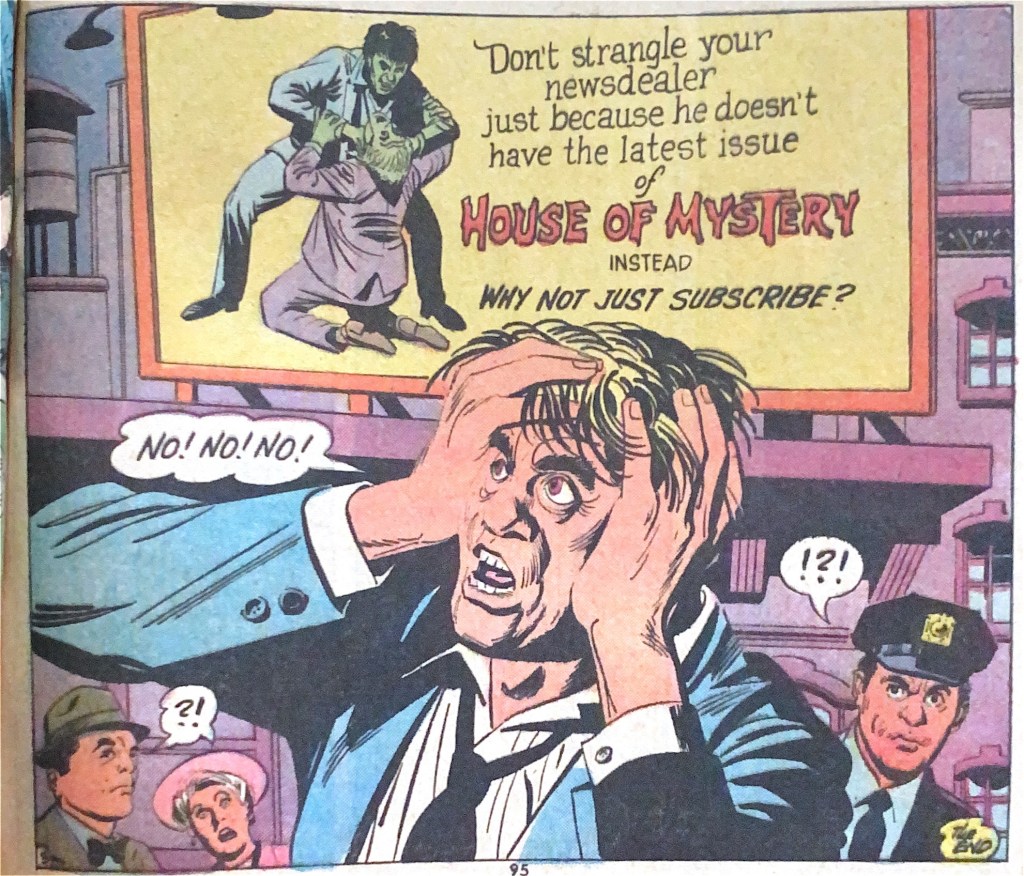 The final story, another new one, isn’t spooky but it is rather wonderful, as Steve Skeates and Mike Sekowsky’s tale of a strangler and a photographer turns out to be a cunning subscription ad. It’s a hoot, from the very silly opening panel to the final reveal, with some of the best Sekowsky work I’ve seen.