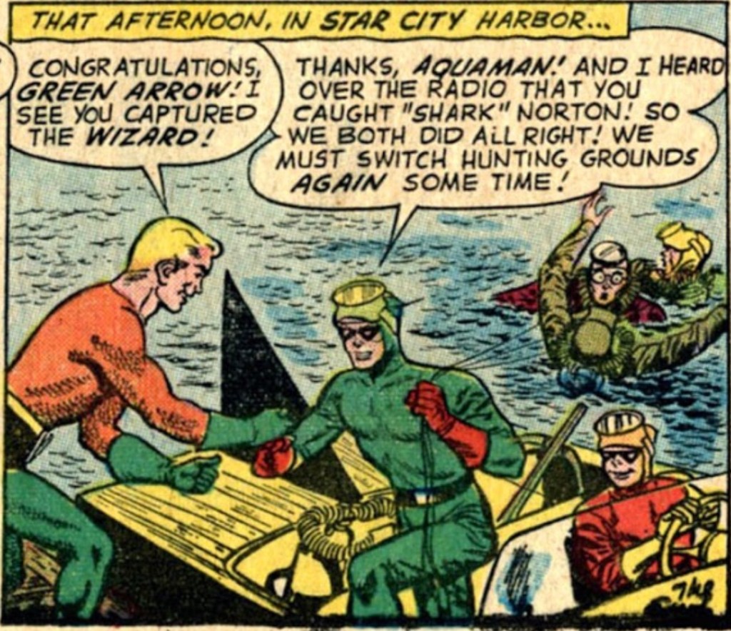 Given they debuted in the same book, More Fun Comics #73 in 1941, and were in the Justice League of America together for years, it’s surprising how seldom these heroes have worked together as a pair. This story reminds me of Manhunt on Land/The Underwater Archers from Adventure Comics #267 in 1959, which saw Ollie dive into a watery case while Arthur chases a bad guy on land. The heroes never actually team up, meeting in just a single panel.