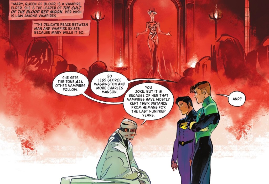 Somehow it bothers me that Tynion is co-writing it with Rosenberg. (To be fair, it was always solicited that way.) There’s just some disappointing stuff about him these days – I am paying (for now) for his $7/month substack newsletter subscription, because I wanted the inside scoop on DC, Batman, 5G and the rest, but (1) he has already bailed on the very Batman newsletters I’m paying $7 for (he cut it from weekly to twice a month, and now is more than a week late on top of that), and (2) while he made a big deal about how important this vampire book is to him, isn’t that belied by having a co-writer? Meanwhile, his Batman Fear State event is petering out into a big nothing buoyed only by Jorge Jiminez’s stunning work (best looking work in comicdom at the moment), and his Joker book has declined precipitously in quality. As far as I can tell, he’s as psychologically out the door of DC as Bendis is. And it makes me not really want to read his remaining DC work.