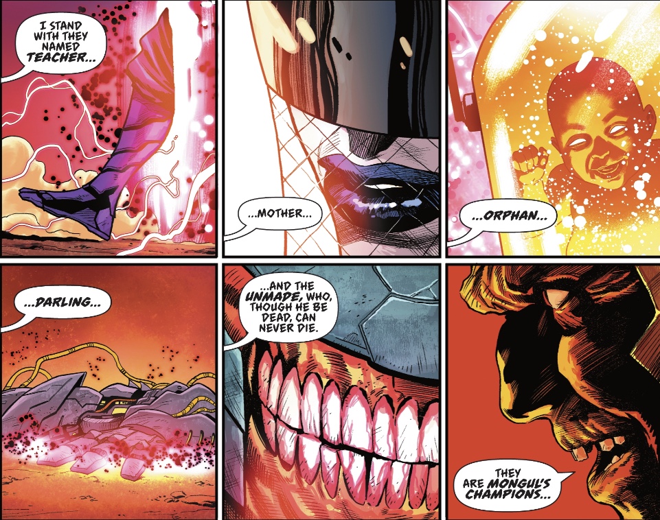 Daniel Sampere’s art is the proverbial feast for the eyes – it’s big, bold storytelling featuring great-looking superhumans and delightfully weird aliens… Chaytil, who likely hacked off his own limbs to get a promotion from Mongul, is my favourite but his back-up team is also something – some things – to savour.