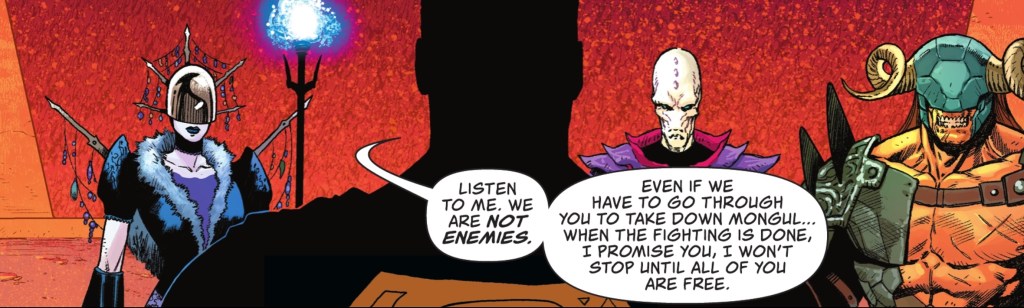 The Man of Steel isn’t put off, leading the team against a gang of Warzoons – warriors loyal to Mongol – before making a heartfelt promise to free the planet’s slaves. One being who isn’t impressed is Mongul’s most dedicated boot-licker.