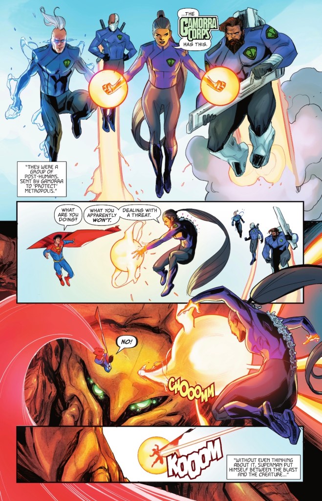 Meanwhile, Superman’s enemy, Gamorra president Henry Bendix – the man who disappeared Jay’s politician mother – takes advantage of the incident in Metropolis Harbour. Using Luthor teleportation tech, Bendix brings in a quartet of his homemade metahumans. Unlike Superman and Aquaman, though, they’re not out to understand the leviathan.