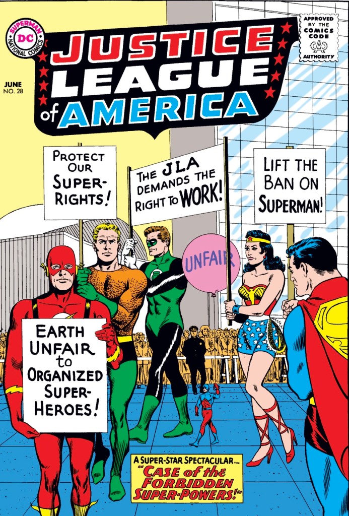 Anyway, the cover reminds me of those Golden Age issues in which heroes would urge readers to buy War Bonds, and of a Silver Age Justice League of America in which team members were parading with placards in a bid to unionise. Fun times.