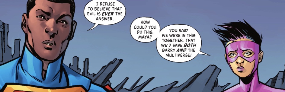 And so the stage is set for the action-packed second half of the issue, as we move from past to present and hope that there’s a future. Not that I minded the knitting together of decades worth of DC events, I’m a sucker for deep continuity cuts, and writers Joshua Williamson and Dennis Culver make a convincing case that superhero comics really are the Never-Ending Battle, with the Multiverse a body at war with itself, and superheroes as antibodies.