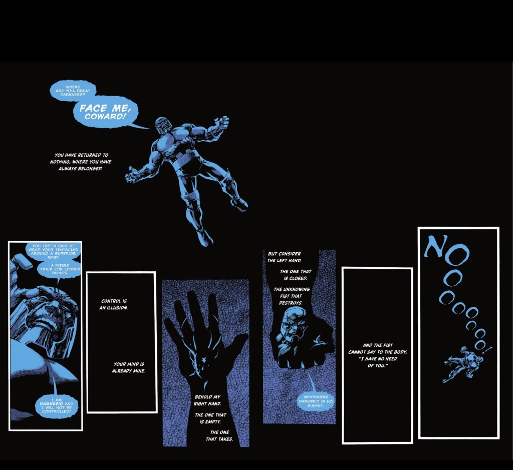 It’s the final issue of the dimension-spanning mini-series and the threat of the Great Darkness is growing. The primal force that wants to wipe out the light of not just one, but two, multiverses is ever encroaching. Hope comes in an unlikely form.