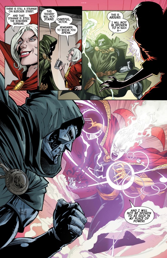 Dr Doom doesn’t take well to Clea’s refusal to give up her seals of office. He underestimates her.