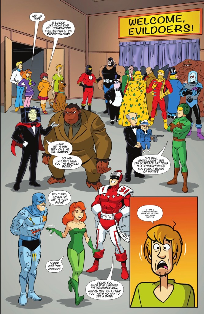 I can’t recommend this issue highly enough. Sholly Fisch constructs a story that makes total sense in a world in which both Batman and Scooby-Doo regularly get together to solve mysteries. The gags perfectly fit character and situation, with Fisch’s deep familiarity with Gotham history informing the story in ways that won’t have newer readers feeling excluded. All you need to know for a scene involving Cluemaster and Signalman, for example, is their names, which are right there.