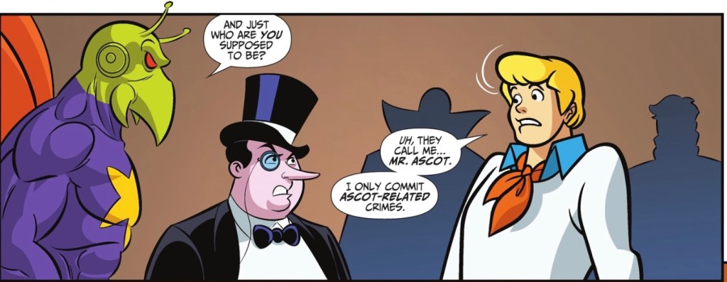 And a big part of that is the skill of longtime Scooby artist Dario Brizuela, who seamlessly blends everyone Gotham into Mystery Inc’s visual landscape. I defy anyone to see this art and not hear the classic Scooby-Doo music cues, or running-in-midair sting. There’s not a bad panel in the book, and many brilliant ones – the fight scenes are especially wonderful. Who could have predicted that a frame involving Crazy Quilt and big screen breakout character Mr Polka Dot would make my day?