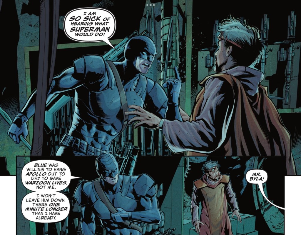 He’s down, but not out. As the days pass, and he begins searching for his husband Apollo, Midnighter encounters the same reluctance on the part of prisoners to embrace liberation as has Superman. Unlike the Man of Steel, though, Midnighter has no time for soft words; he tells it like it is.