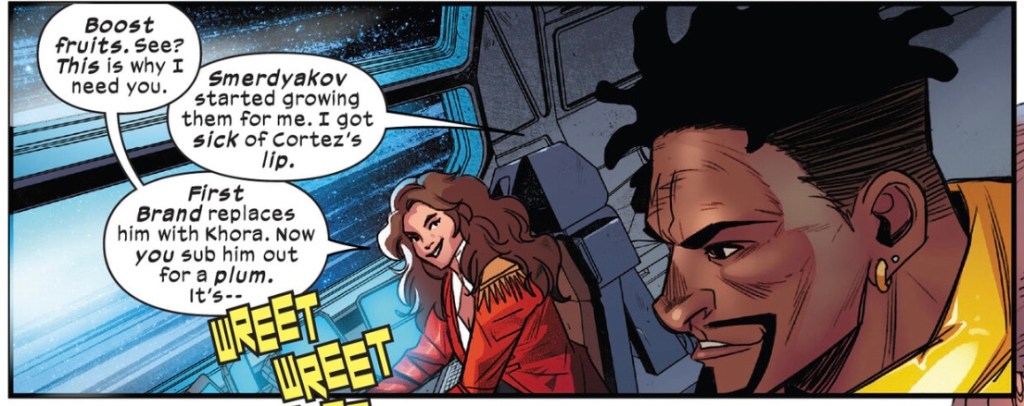 ‘Boost fruits’ I understand from the previous page. (Abigail) Brand I know, ‘Cortez’ is likely Fabian Cortez, who I remember as a name in a villain team. But who the heck are ‘Smardyakov’ and ‘Khora‘? Orlando likely intends the dialogue as throwaway texture, but it’s offputting. When I was a kid you could jump into a series such as the X-Men, or Legion of Super-Heroes, wonder about the occasional unfamiliar names sprinkled in, and enjoy finding out who these people were in time. With current X-books, though, there are far too many references to offstage folk.