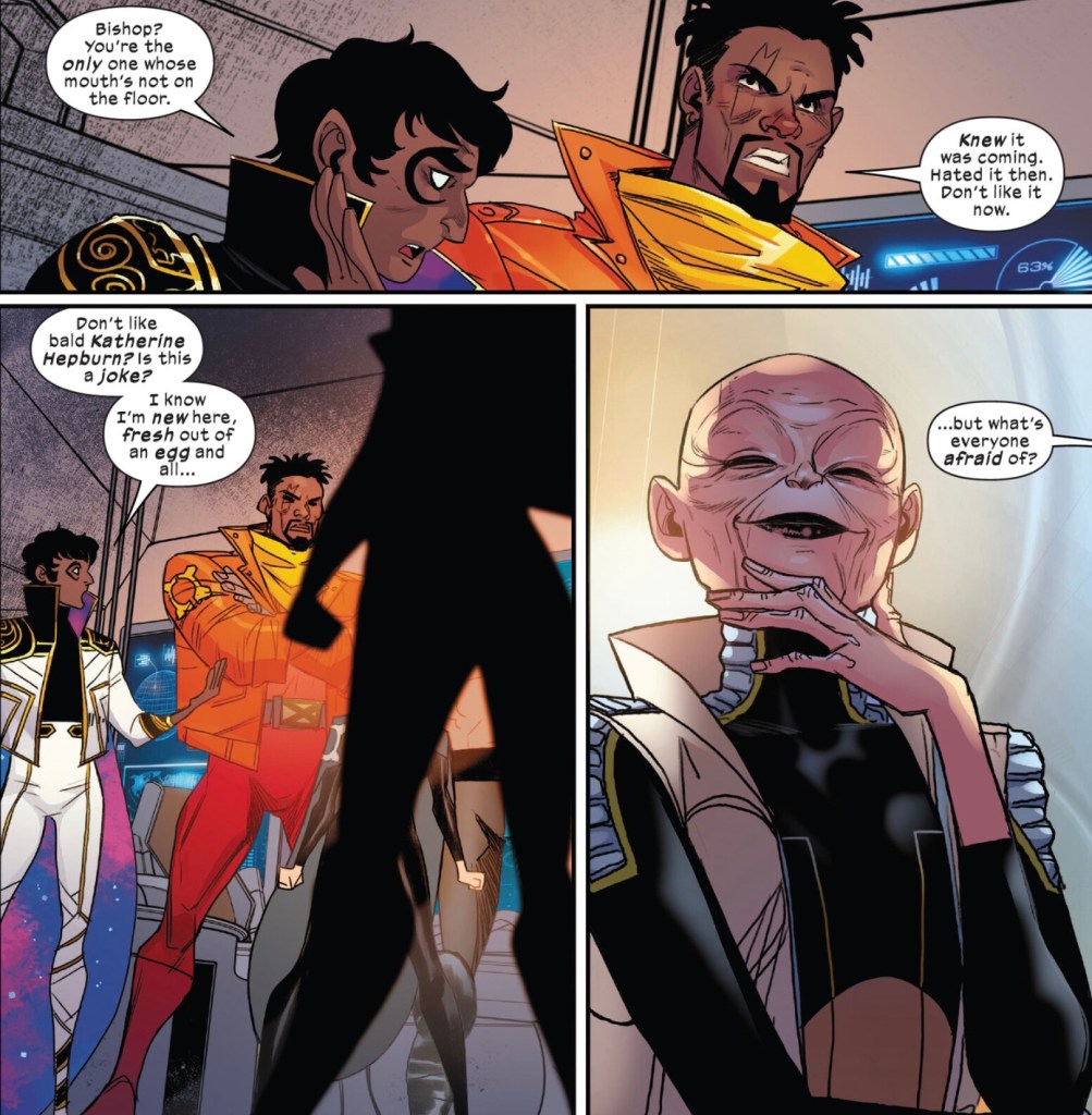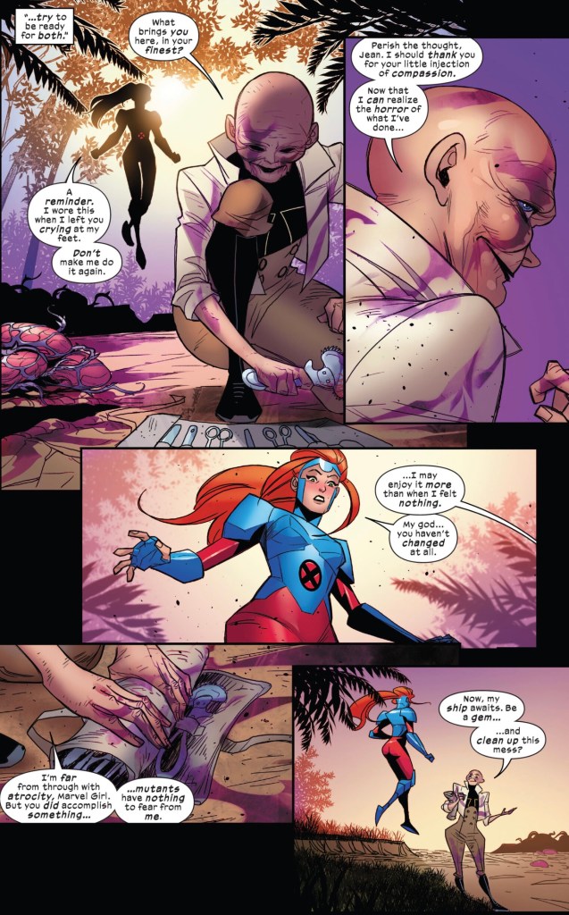 I suspect Cassandra is like a particularly hairy spider – just being around her gives you the creeps. I honestly don’t know what Kate is thinking here – sure, every X-team needs a telepath, but it’s not like there’s a dearth to choose from on Krakoa. Heck, Betsy Braddock, Psylocke, is right there! And despite Jean Grey’s assurances that this is a clean slate Cassandra, if you’re thinking Nature vs Nurture, Cassandra never had the Nurture part. She’s all bad seed, as she reveals to Jean Grey when she shows up to warn Cassandra to behave.