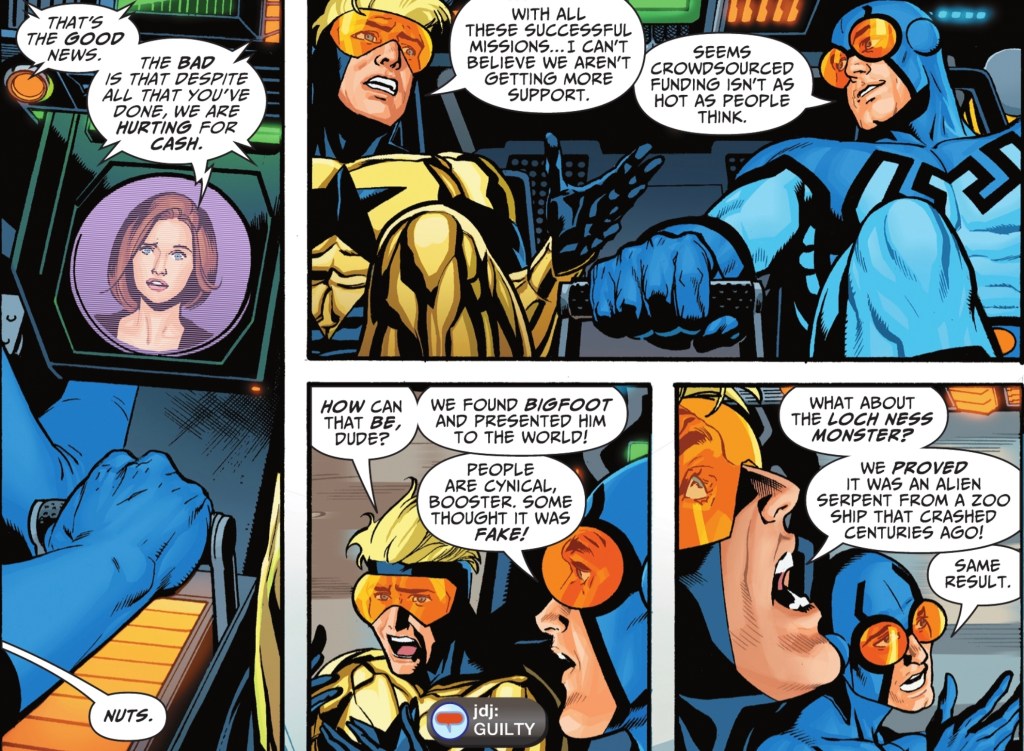 Aha, the Black Beetle, enemy of not only Booster, but Blue Beetles Jaime Reyes and Ted Kord. And this issue we learn who he really is. The reveal is satisfying – he has a classic comic book motive – though I’m not convinced it will stick. Well, he’s claimed to be a different person pretty much every time he’s popped up.