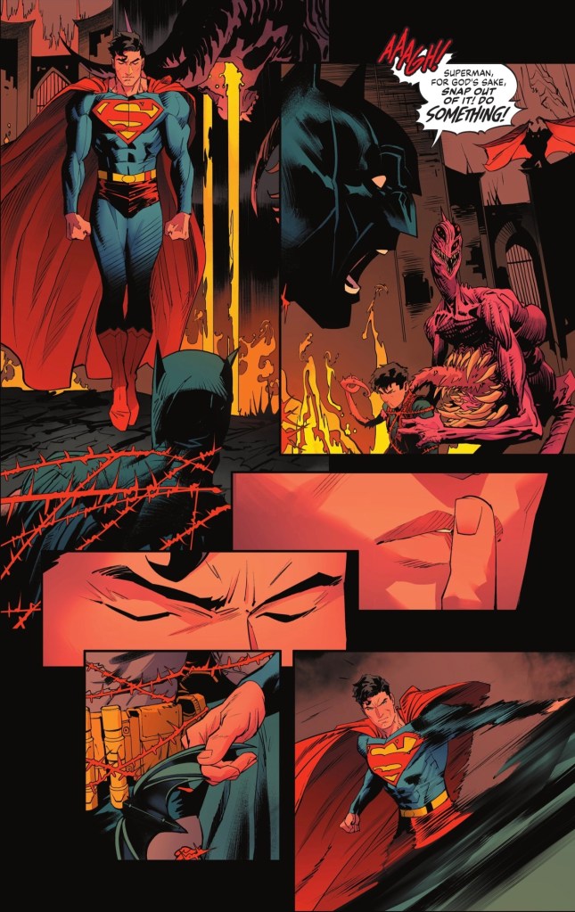 Mora and Bonvillain’s cover image is a good-looking representation of the overall story, with the complementary positioned Batman and Superman terribly pleasing. Not that I’m OCD or anything….