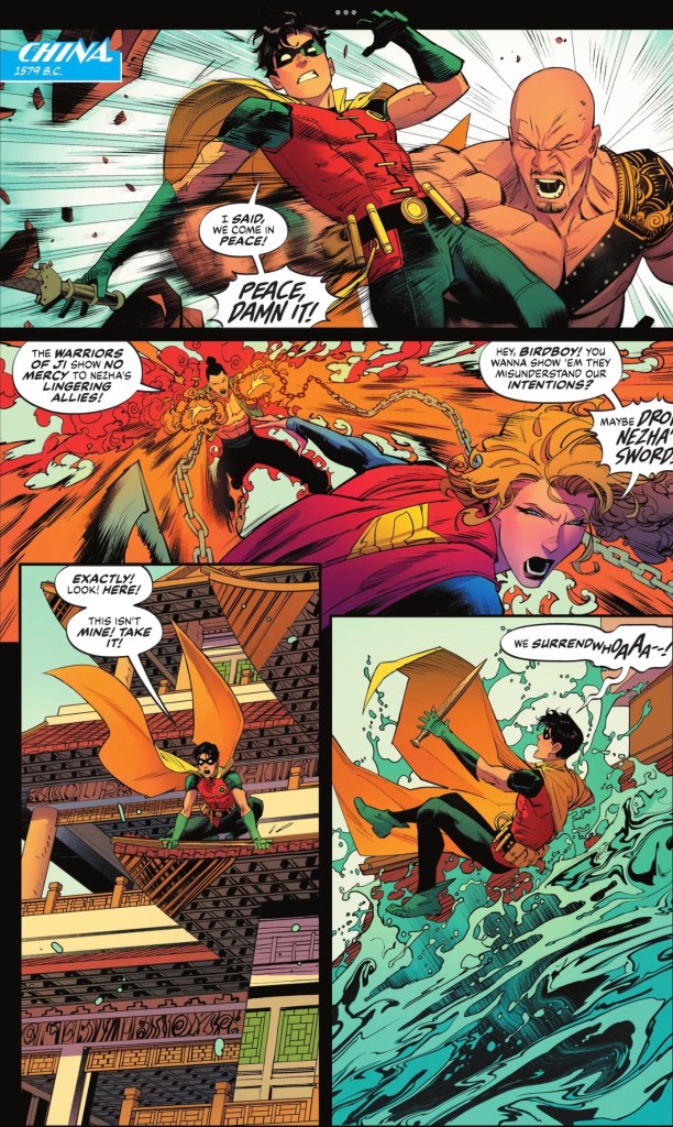 And in ancient China, Supergirl and Robin bid to learn how the recently re-emerged Nezha was once defeated by the heroes known as the Warriors of Ji.