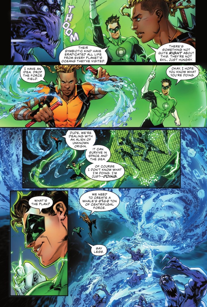 The creature at the start of the story is very different at the end, in appearance and nature, and it’s not at all clear why. And Hal Jordan is terribly brusque with young Jackson, whose head of worms belies his competence. I’ve no problems with the art of illustrator Fico Ossio and colourist Sebastian Cheng, which is enjoyably bombastic – the initial monster looks very scary.