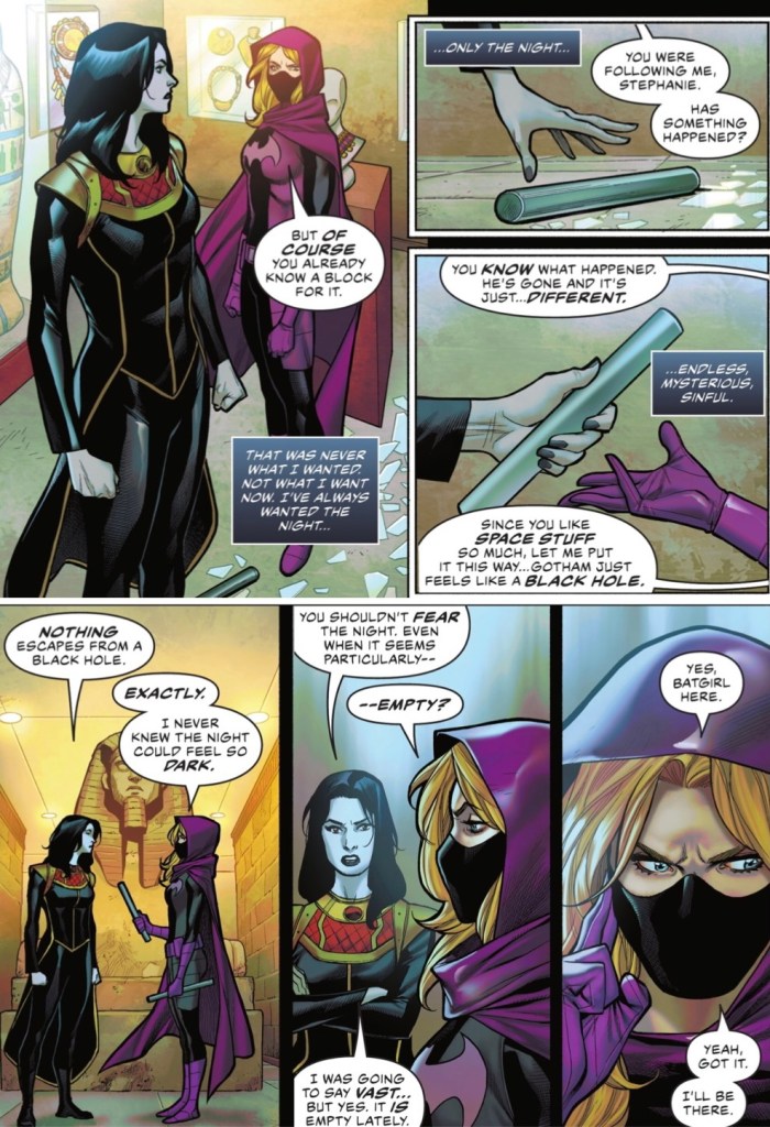 Finally, Batgirl Stephanie Brown has an encounter with Gotham ghoul Nocturna. What begins as a traditional hero vs villain confrontation turns into something more subtle, a heart to heart.