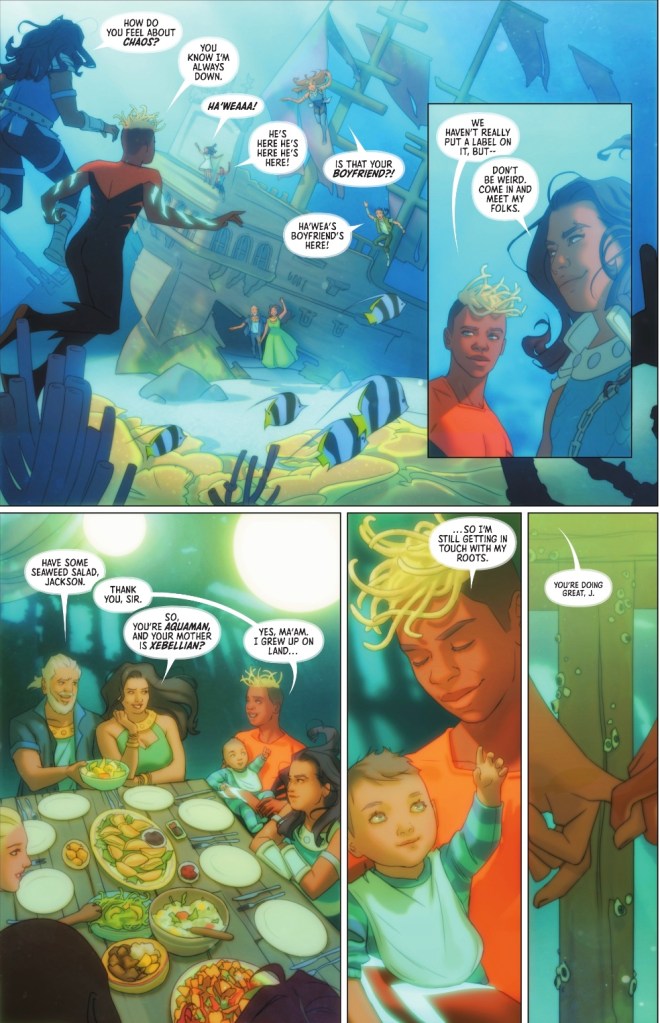 Jackson Hyde and his new boyfriend, Ha’weaaa, explore one another’s backgrounds and our young Aquaman frets about his heritage. Again. And resolves to move on. Again. He should change his name to Groundhogdayman. The date goes well, the gorgeous art works hard to give us a sense of undersea life and, refreshingly, Ha’weaaa doesn’t have a superhero physique – but there’s no real reason for the story beyond Jackson visibility.