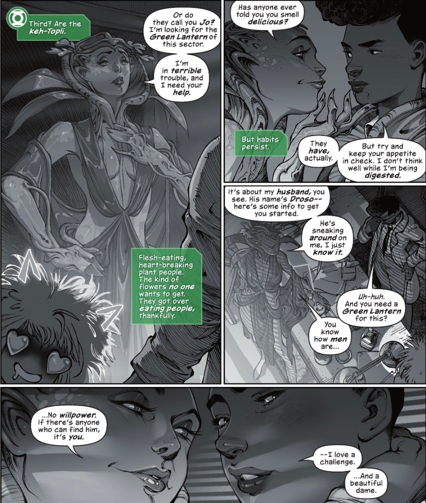 I’ve not much experience of Green Lantern Jo Mullein but the basics of her world are explained on the first page of her strip, an amusing sci-fi noir tale which challenges the assumptions many people make about bisexuals. The art is grey toned with green highlights and rather excellent – when full colour arrives, it’s earned.