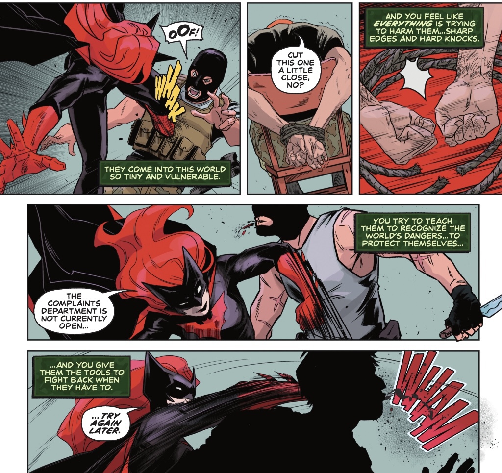 Batwoman rescues her dad as he thinks about what a great, strong daughter she is. The art is suitably kinetic.