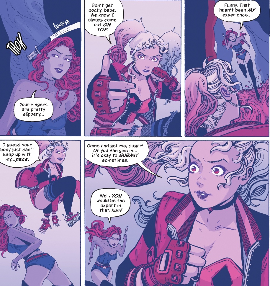 Poison Ivy and Harley Quinn’s twee sex games are interrupted by a passing emotional vampire. The delicate art is interesting but I’d like it more with a less limited colour palette. The story is embarrassing.