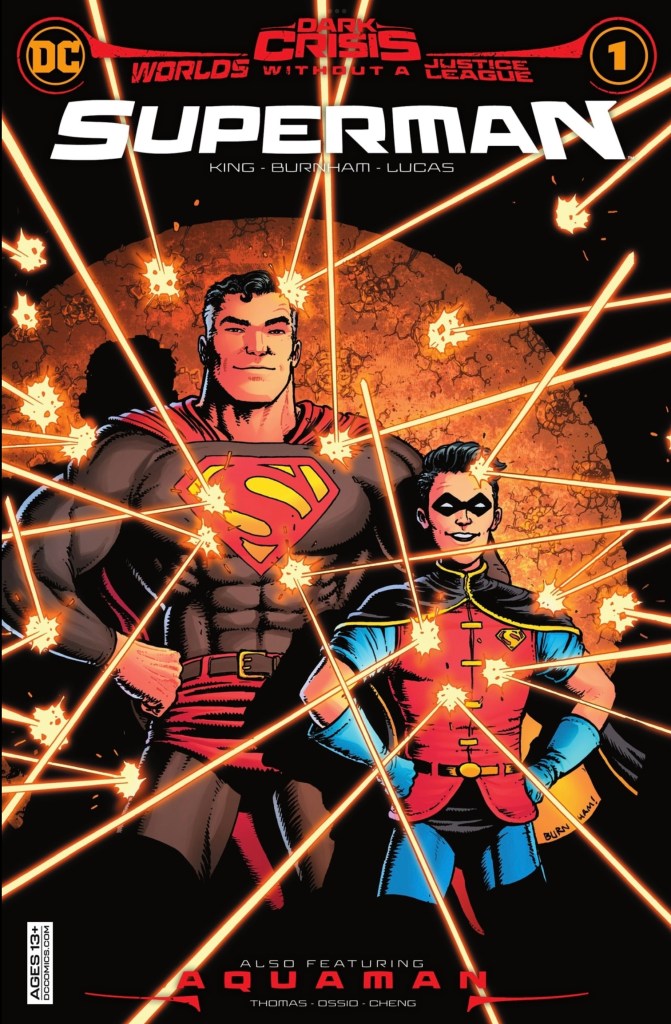 Dark Crisis: World Without a Justice League – Superman. That’s a bit of a mouthful as titles go, but it does make clear what’s going on with the two stories in this Dark Crisis spin-off. Two? Yep, because as well as a main strip starting Superman and Superboy, there’s a back-up centring on Aquaman and his family.
