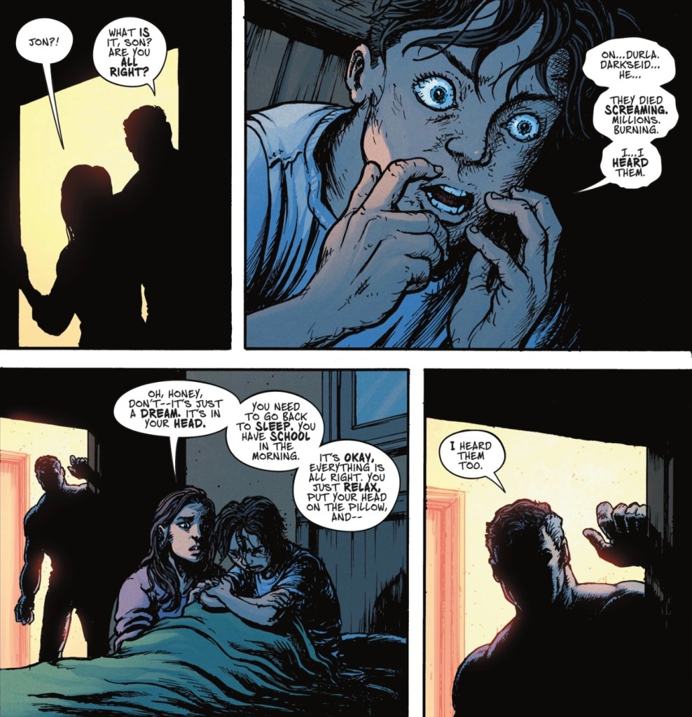 Little by little, in chapters giving snapshots of Jon’s life from the ages of 13 to 18, we see how Jon deals with the knowledge that what’s out there is Darkseid, and learn that Superman had made a peace pact with the lord of Apokolips. Darkseid has always liked a good peace pact.