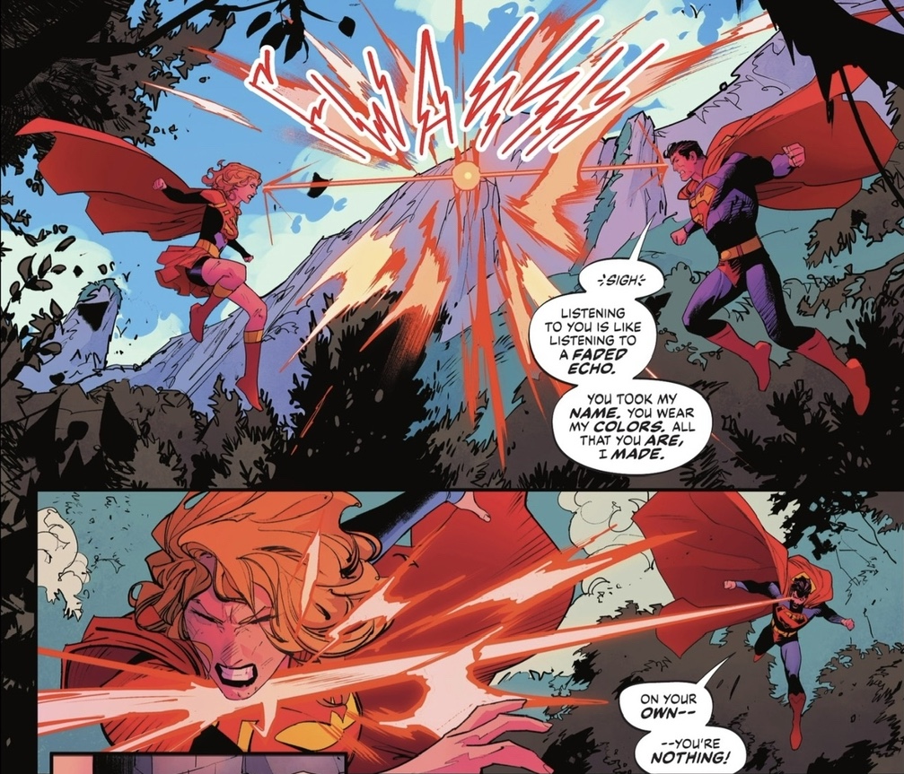 Ah, the old vulnerability to magic. There follows a feud of the titans between the Super-Cousins, with Clark saying some pretty harsh words to Kara.