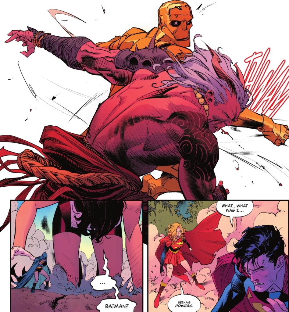Well what do you know, a tin man succeeds where a Man of Steel fails. Of course, this still leaves the original problem of whether someone will have to sacrifice themselves to keep Nezha away from the World of Today. Perhaps a classic piece of DC kit can save the day…