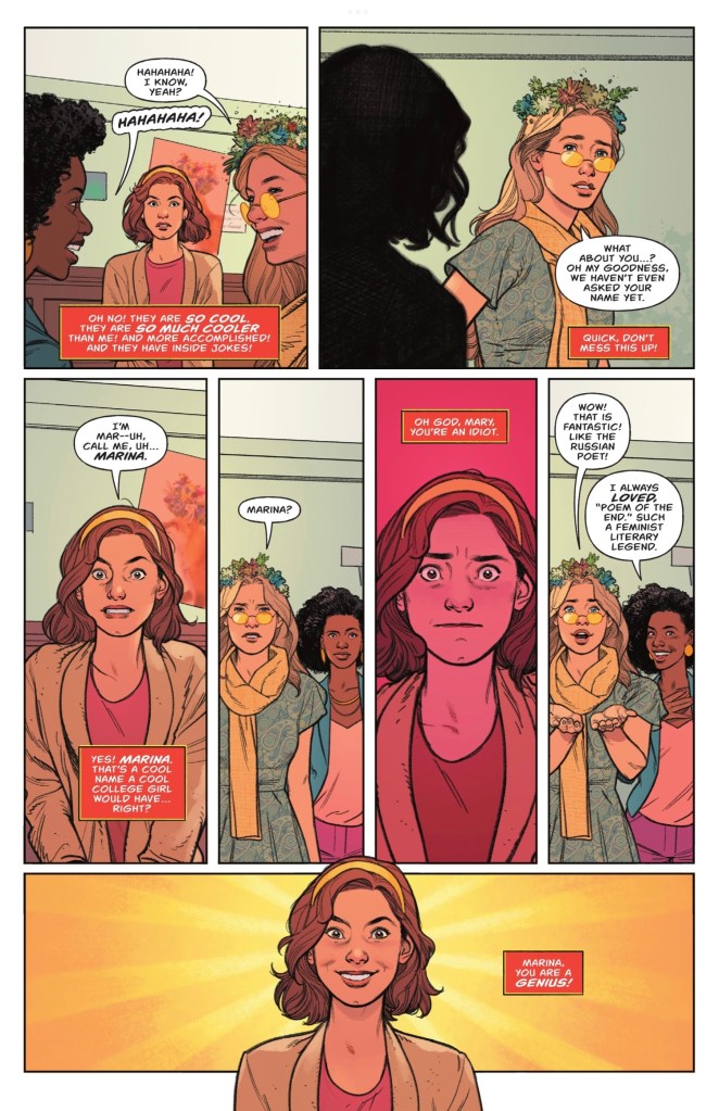 This reads like a YA novel to me (though it’s so retro looking, and evokes such a nice nostalgic feeling, that I enjoyed it despite that). Being YA, it’s about finding oneself (the theme of all YA novels). Most obviously stated, she needs to figure out who “Mary” is – does she need to put on the air of a cooler “Marina”? (The answer will be no.) Does she not fit in? (The answer by the end will be that she does.) The theme is spelled out in the early pages – college is for “finding yourself… figure out who Mary really is.”