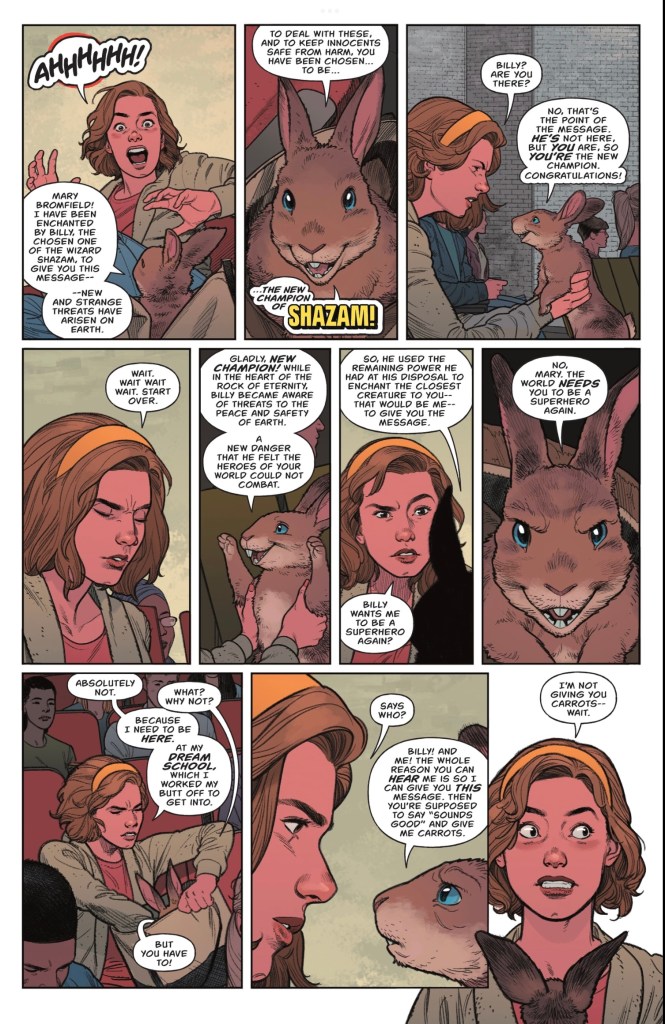 I wonder if Campbell is going to explore the fact Mary is steamrolled into becoming a superhero once again. She’s very clear that she doesn’t want to be Mary Shazam or whoever, but it seems ‘no’ doesn’t mean ‘no’ to the long ears of an enchanted rabbit. It’s all very well being a ‘Chosen One’ in the Golden Age of comics but it feels less comfortable today.