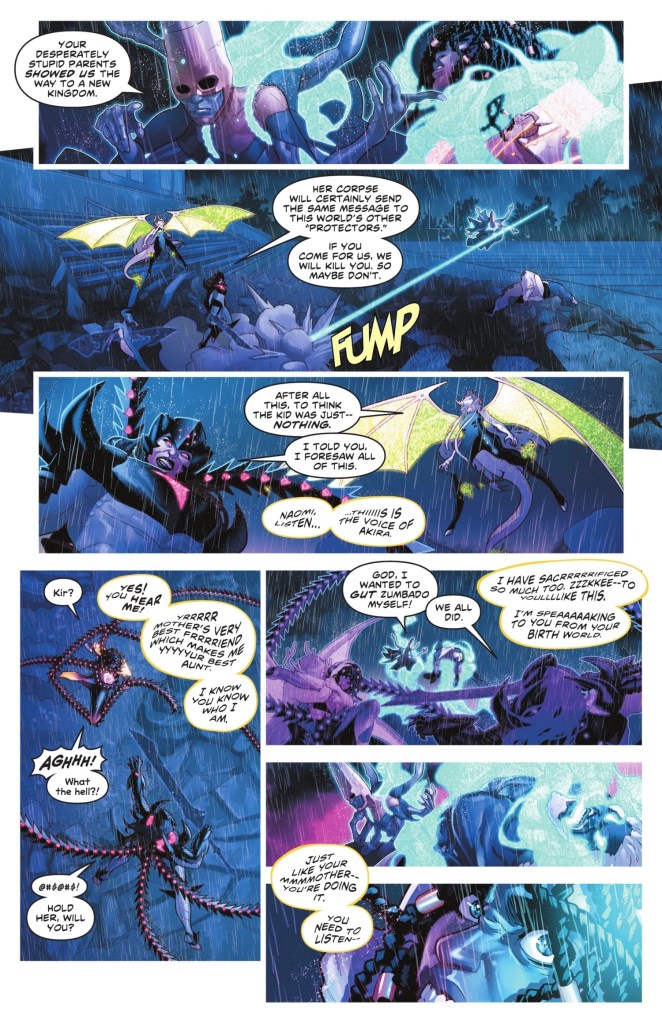The end of the issue has Naomi going to her former world to help rebuild it. And her Earth parents are just fine with that, their huge fears about her safety in her new life of heroes and villains suddenly vanished. There’s no suggestion that they, or space warrior pal Dee, might actually go with Naomi and support her. And don’t ask how Naomi’s quest fits into the Death of the Justice League business
