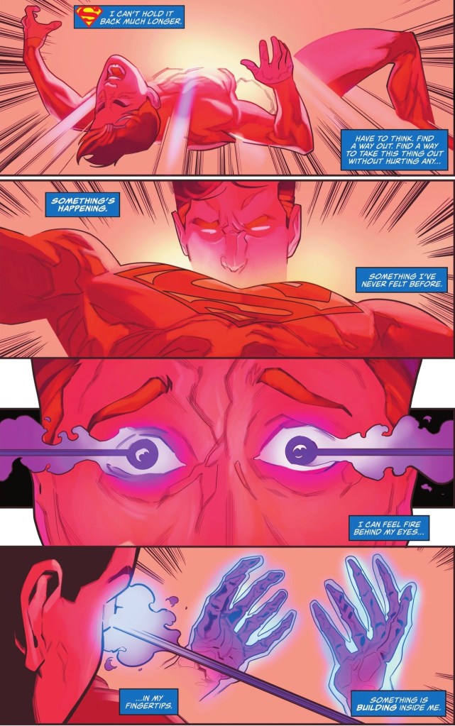Now, we don’t see what happens but it looks like he’s building up to the solar flare moment, first manifested by Supergirl, copied by Superman and forgotten about for the last few years. The flare business sees a Kryptonian expend all their energy in one burst, then be powerless for a day as they recharge. Taylor leaves it a mystery, hopefully to be solved next time when we get…