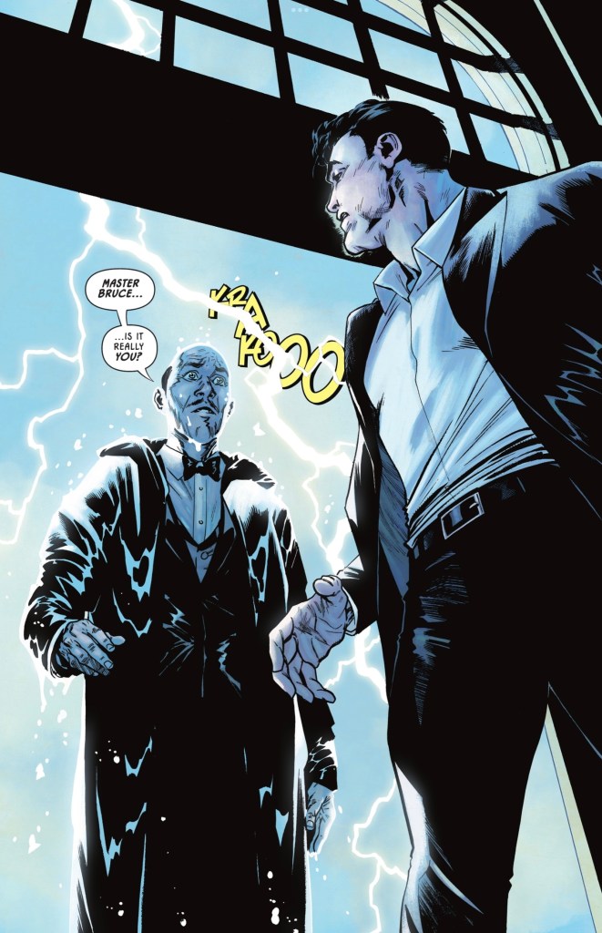 It’s Alfred Pennyworth, apparently back from the dead after being murdered by Bane, and cremated by Bruce. Is it a cruel ploy by Clayface, Hugo Strange or some other Bat-foe? A battery of questions are answered satisfactorily by the longtime Wayne Family retainer, so Bruce and the man claiming to be Alfred head down to the Batcave for medical tests. Someone is waiting for them.