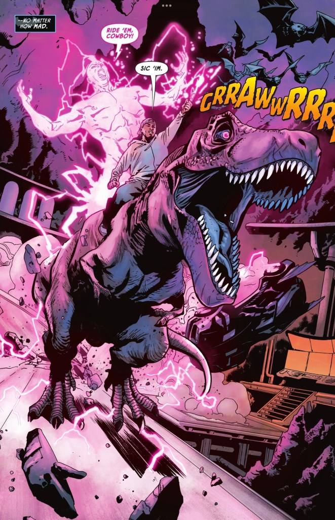 Now that’s moody. The colours of Jodie Bellaire help, of course, the dark purple complementing the black and grey. Bellaire’s work is exemplary throughout, with the Batcave especially nicely lit… it’s just a shame Robin’s current costume colour scheme – drab – precludes her giving the Boy Wonder extra visual pop. The letters of Steve Wands add another layer of comic book fun with perfect sound effects, cleverly coloured.