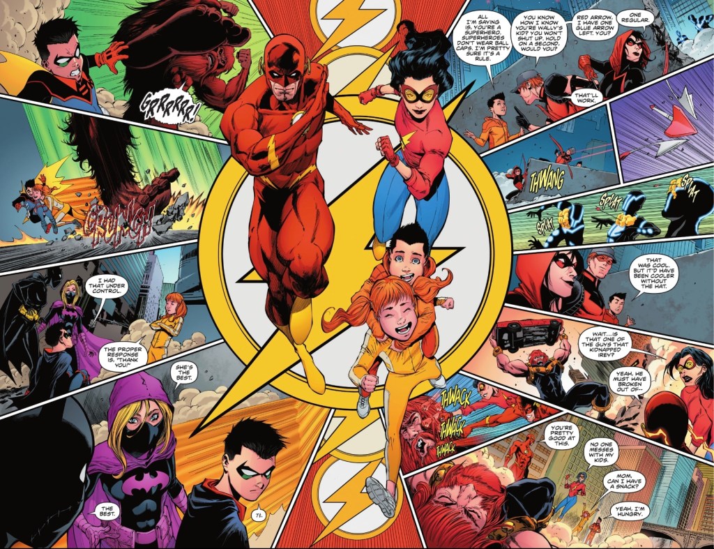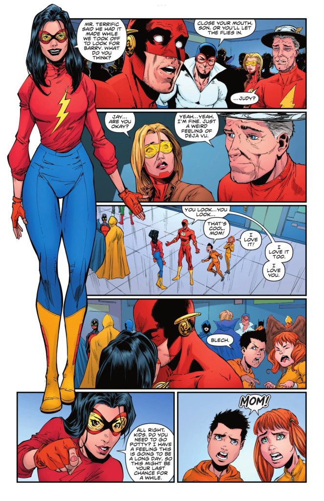 ‘They’ are the Flash Family, more a super-speed clan than ever with Linda now able to run fast like husband Wally and daughter Irey. The plan is that the Flash, Irey, super-strong twin Jai aka Surge, Golden Age Flash Jay Garrick, Max Mercury, Kid Flash Wallace West, Jesse Quick and, er, Mrs Flash put out as many villainous fires as possible, and help the other heroes in between.