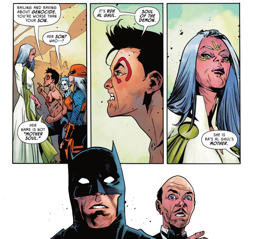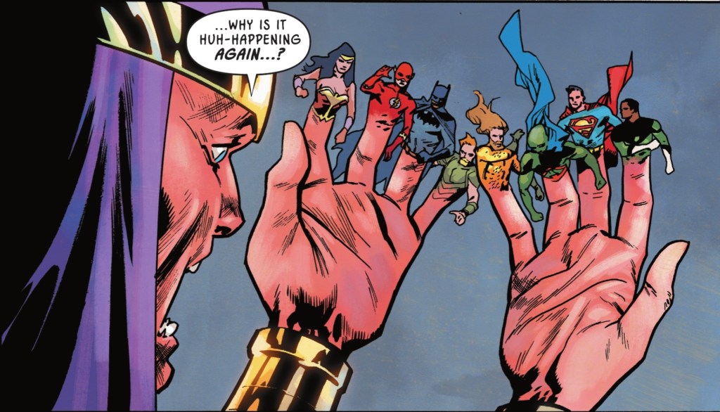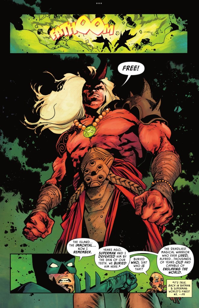 Good on writer Mark Waid for bringing readers who haven’t been reading Joshua Williamson’s Robin series (I gave up after #2) or his own World’s Finest (love it!) up to date with what’s brought us to Batman vs Robin. And if you don’t need the flashbacks, there’s lots more to enjoy, including the efforts of some of Earth’s nastiest mystics to steal enchanted tat for Nezha in return for a power boost. There’s Bruce’s continuing reunion with Alfred. And a callback to the first ever Justice League of America I read.