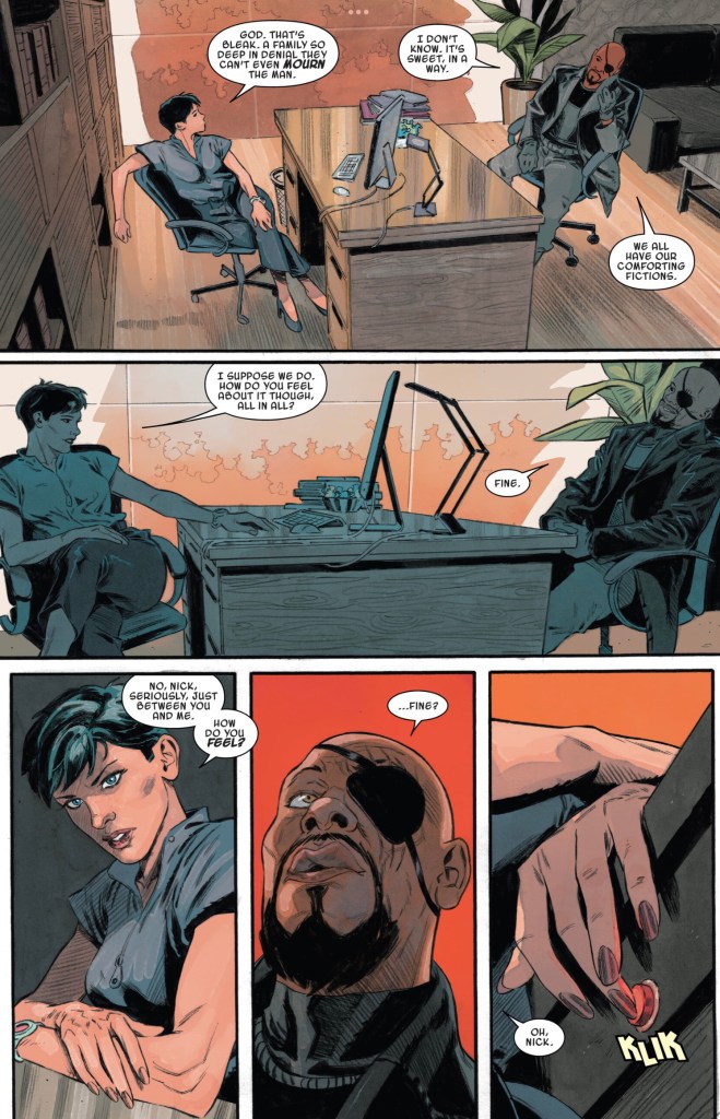 Later, we see Fury – now an independent agent – dropping in on Hill in her new CIA role to update her on events.
