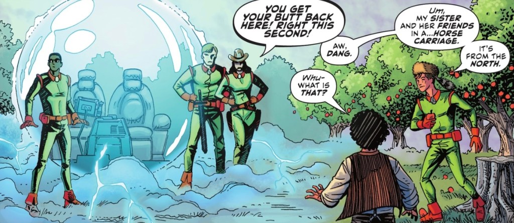 OK, the borders based on Benday dots should all be yellow, but let’s blame the Time Masters. Yeah, that’s it. They’ve plucked the kids – along with Golden Age Aquaman and Mr Miracle – from continuity and kept them in stasis, presumably for some convoluted reason relating to the safety of all time and space. Events in Flashpoint Beyond have somehow returned the lost to their points of origin, and we’ll be following them into the upcoming Stargirl: the Lost Children six-issue mini (we glimpsed them in last year’s Stargirl Spring Break Special.