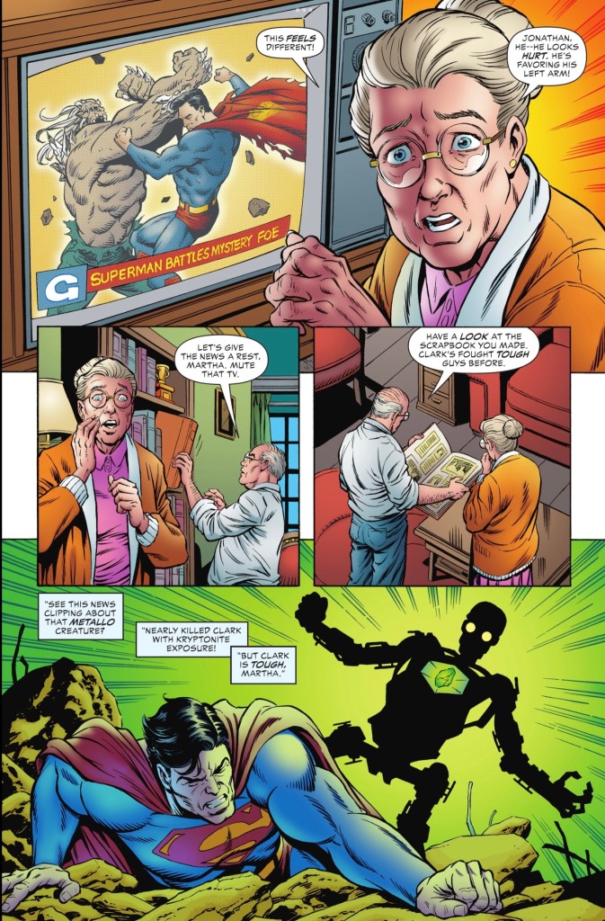 Next we have ‘Above and Beyond’ and a reunion of the Jerry Ordway, Tom Grummett, Doug Hazlewood and Glenn Whitmore Adventures of Superman gang. Joined by current Superman letterer Rob Leigh, writer, artists and colourist expand the original stories’ reactions of Ma and Pa Kent, stuck in Smallville watching their son’s bloodiest battle on TV. In an attempt to calm Martha, Jonathan switches the box off and they flock through her scrapbook of cuttings and as we find out that Ma is quite the detective, Jon learns something new about his son. The callbacks to Superman’s post-Crisis period gave me the warm fuzzies.