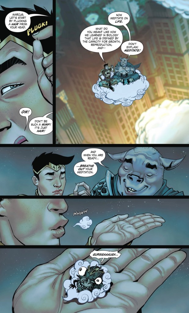 Another day, another city for Marcus Shugel-Shen, who’s been moving around the DC Universe since learning he’s the Monkey Prince, son of a Chinese deity. Taking him places are adoptive parents Laura and Winston who are geniuses, but pretty stupid.