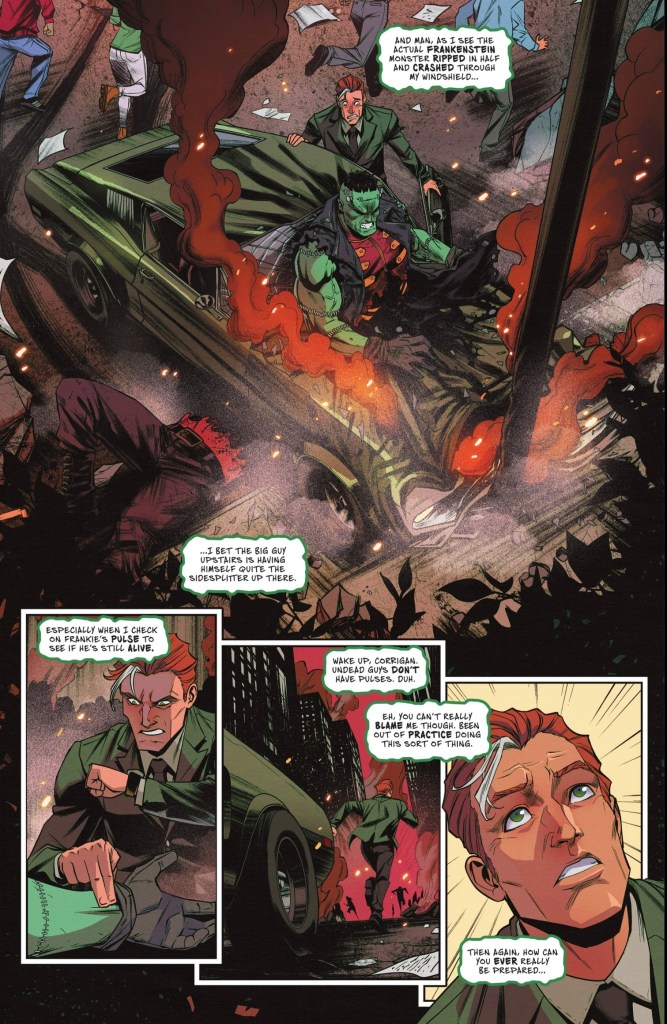 There’s Jim Corrigan racing towards the possessed-by-evil Spectre in the hope he can reunited with the Spirit of Vengeance who used to share his body, and help him regain control. Frank Tieri gives Corrigan a ‘tougher’ voice than usual in a straightforward tale whose highlight is a run-in with super spy Frankenstein. The Frankie moment carries over from Dark Crisis on Infinite Earths #6, while this tale will be picked up on in… I don’t know, the story ends with ‘END?’ Probably Dark Crisis #7. Anyway, it’s a diverting few pages, with nice art from Serg Acuña, though you could easily skip it… I mean, is it exciting that Corrigan and the Spectre are reuniting when probably no one knew Corrigan and the Spectre had split?