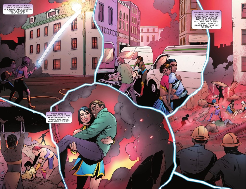 Writer Stephanie Williams and artist Caitlin Yarsky show us that while the superheroes such as Wonder Woman battle the supervillains, regular Amazons leave Paradise Island to help firefighters hold their hoses. Whee. I wish DC would stop trying to make the Amazons a thing, all we need is one great Wonder Woman comic with Amazons as occasional supporting characters, not multiple strips with no reason to exist.